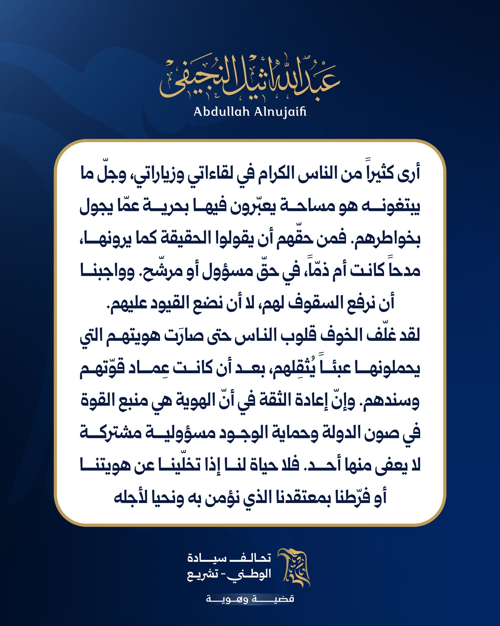 وشدد النجيفي في تدوينة الكترونية على أنّ “واجبنا أن نرفع السقوف للناس لا أن نضع القيود عليهم”، مبيناً أنّ الخوف غلّف قلوب الكثيرين حتى صارت هويتهم عبئاً يثقلهم بعد أن كانت عماد قوتهم وسندهم.